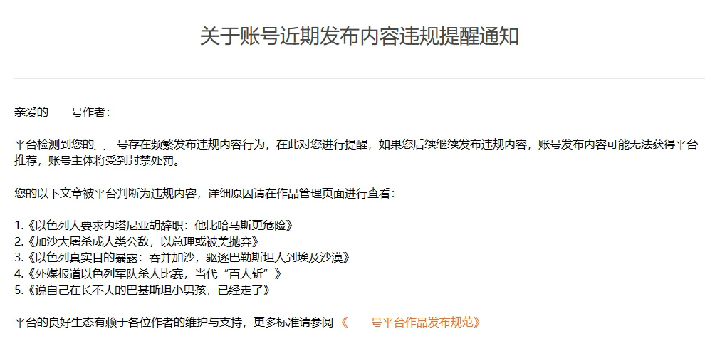 不过,细思极恐的是,我国的某平台,确实有执行以色列“指示”的味道了。因为不支持以色列的文章都被判定所谓的“违规”了。甚至有的文章被以所谓的“违规”删除了,更甚至还有账号被直接短期封禁了。