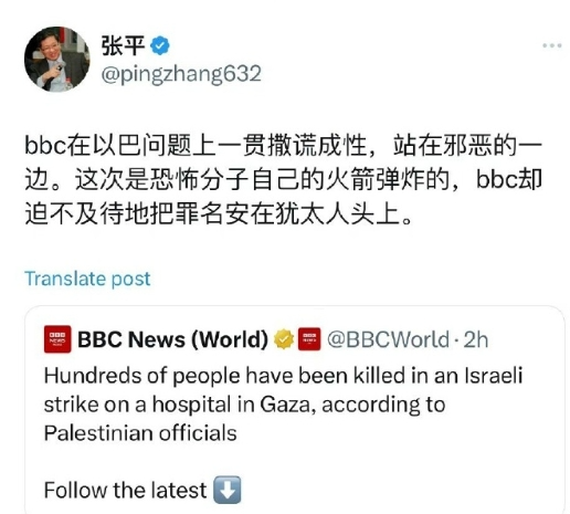 按照以色列驻上海总领馆的标准,张平是绝对不“反犹”的。因为以色列炸了加沙医院这么是个人都知道的事实,张平都能替以色列倒打一耙。