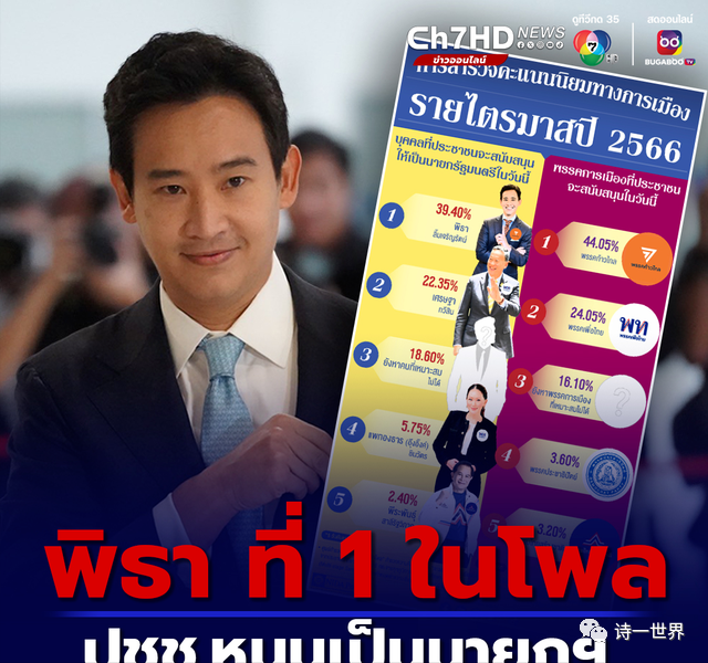 在个人方面,英拉侄女贝东丹只有5.75%支持率,现任总理赛塔支持率为22.35%,而皮塔高达39.40%。